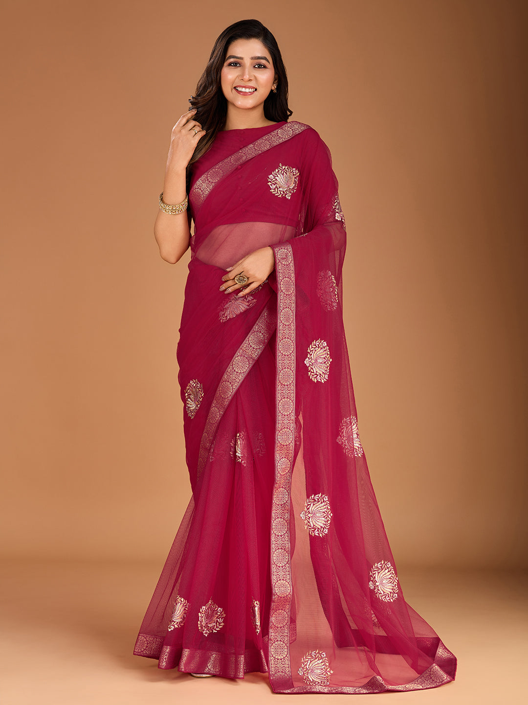 This magenta saree features intricate embroidery and a beautifully detailed border. Made with high-quality fabric, it offers both style and comfort. The saree comes with an unstitched blouse piece, allowing for a customizable fit. Please refer to the image of the actual blouse piece for reference. Elevate your wardrobe with this elegant and versatile saree.