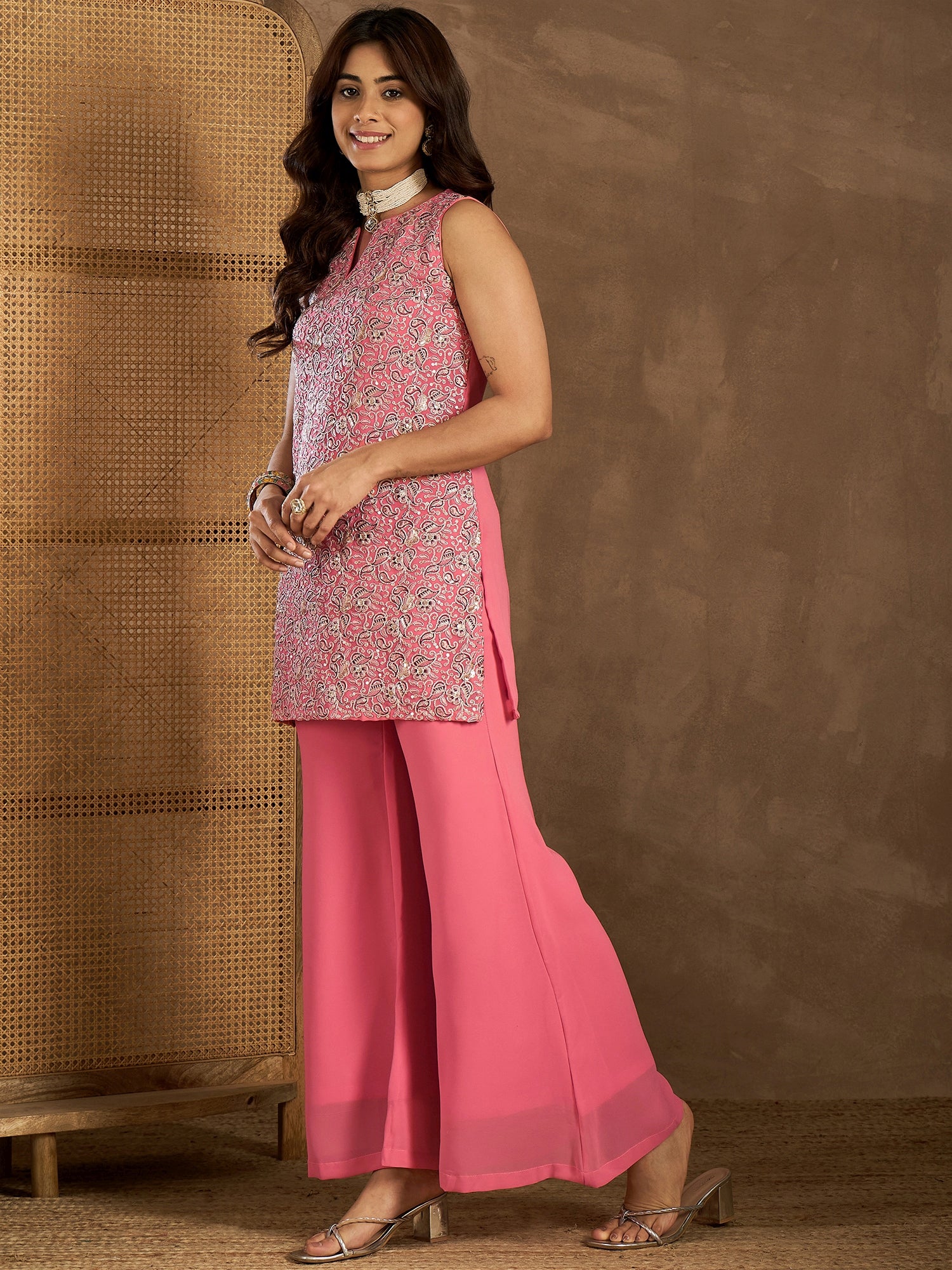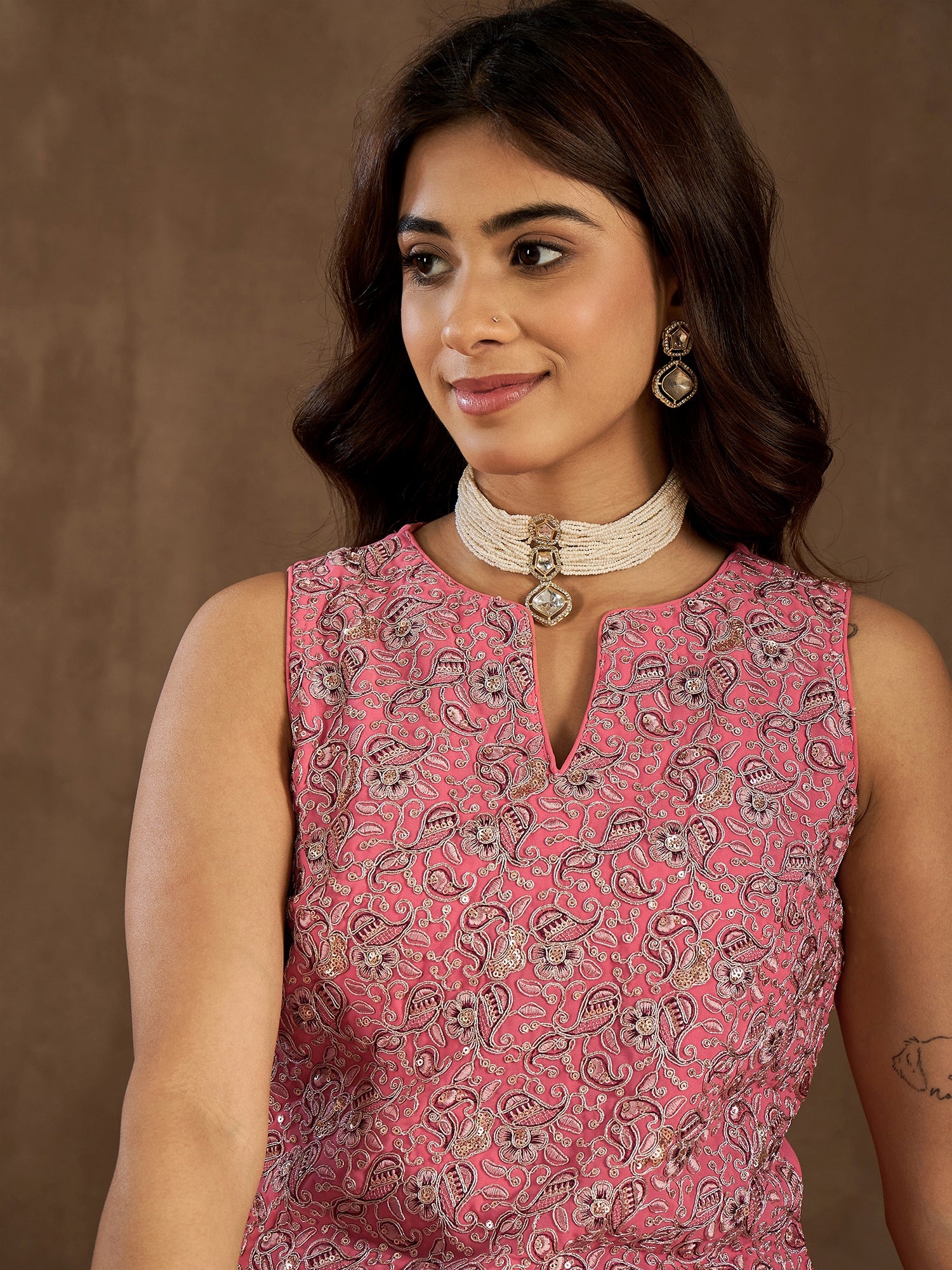 Pink embroidered top , has a round neck and sleeveless, secured with slip-on closure